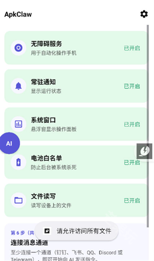 1. 动 ApkClaw 官方版后,请确保所有权限均已开启,以保障其正常运行。